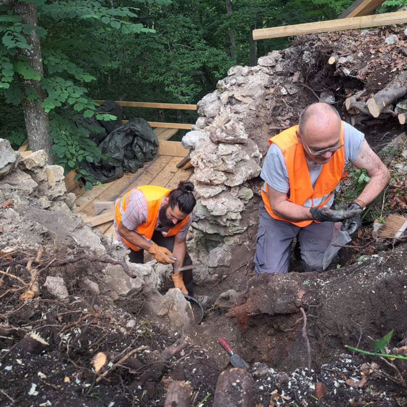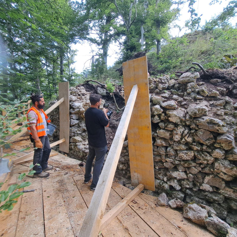 Ein neuer Akteur in unserem Projekt: der Mauerrestaurator Alexandre Aubry, 42, aus Betra bei Horb im Schwarzwald. Dank der Förderung durch das europäische LEADER-Programm, das Projekte im ländlichen Raum unterstützt, haben wir nun die Mittel, um wenigstens die absturzgefährdete westliche Ringmauer zu retten. Da unter der Mauer jedoch nur Steilhang ist, braucht es zunächst eine Arbeitsplattform aus Holz. Logistisch ein Kraftakt, da wir den Einsatz von schwerem Gerät vermeiden wollen. Schwere Maschinen würden den Boden auf dem Berg verdichten und damit archäologische Funde und Bodensedimente mit all ihren Informationen zerstören. Also bleibt die Kraft der Schultern.