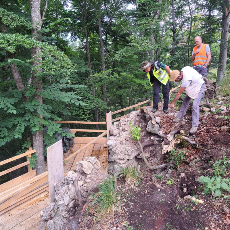 Wieder helfen Lehrer der Berufsschule in Schorndorf, Mitglieder des Projekts und afghanische Flüchtlinge, die sich begeistern ließen. Die Holzdielen der Arbeitsbühne werden vom Fuß des Berges auf die obere Kante der Mauer getragen, das spart Kosten. Zusammen mit einem Zimmermann wird Aubry, der sich auf die Restaurierung historischer Mauern spezialisiert hat, eine 50 Quadratmeter große Plattform bauen. Sieben Meter über dem Steilhang schwebend, elegant, ohne Einsatz von Abgründungen, zwischen die Buchen gespannt – man fühlt sich auf ihr wie in einem Fesselballon zwischen den Baumwipfeln.