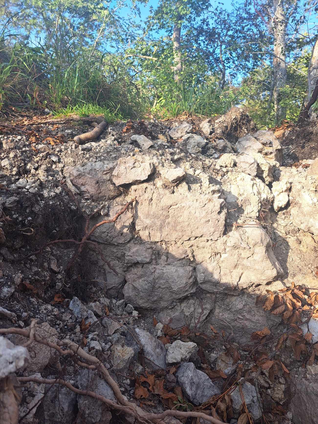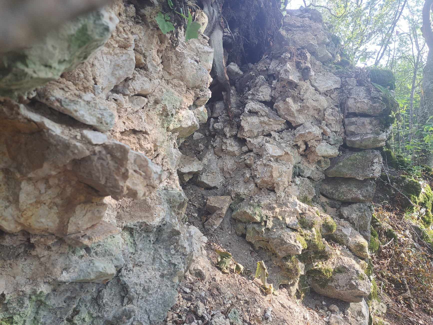 Auf dem kleinen Gipfelplateau, das einst der Hauptturm der Burg war – einer der mächtigsten Türme in der Region, wie unsere Forschungen in den letzten Monaten zeigten – haben die Wurzeln zweier gestürzter Bäume bisher nicht sichtbare Mauern freigegeben. Niemand hatte davor geahnt, dass an diesen Stellen im Untergrund noch Mauern erhalten sind. Und welche Mauern! Erstaunlich gut erhalten.