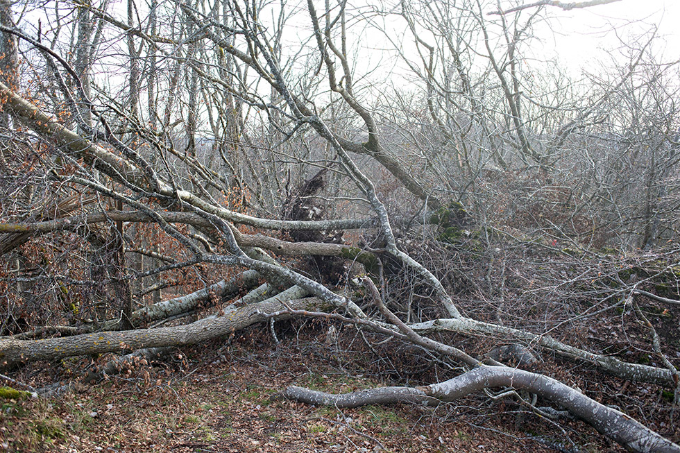 Was als Zeitreise ins Mittelalter gedacht war, wird in diesem Herbst zum Lehrstück in Sachen Gegenwart und Klimawandel. Auf dem Berg liegen Bäume zerfetzt über Bäumen, hunderte von ihnen. In mehreren Lagen sind sie ineinander verkeilt, meterdick und doch zersplittert binnen Sekunden.