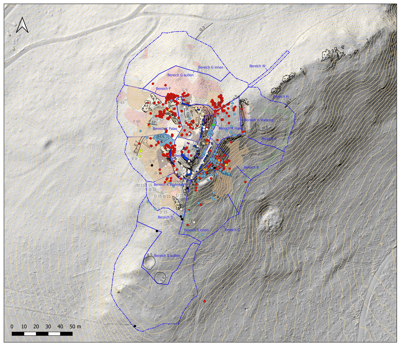 „In der Tendenz treten diese häufig gemeinsam auf, was auf einen relevanten Anteil an gemeinsamer Entsorgung über den Hausmüll schließen lassen dürfte. Gleichwohl sind Unterschiede zu verzeichnen: Die Osthälfte der Burg ist wesentlich reicher an oberflächlichem Müll, wobei der Anteil an Ofenkeramik eher gering ist. Deutlich größer ist der auf der Westseite, wo es insgesamt weniger Keramikaufkommen gibt. Man wird daraus folgern können, dass die beheizbaren Wohngebäude wohl allesamt westlich des Hauptgrats zu suchen sind. Eine Detailbetrachtung ergibt, dass zwar der Großteil der Ofenkeramikfunde mit hoher Wahrscheinlichkeit auf den Wohnturm zurückgeht, es gibt jedoch auch eine Streuung, die vom nördlich des Turms gelegenen „Zwischenbauareal“ ausgeht. Dieses Areal wurde – rein heuristisch – so bezeichnet, da der Survey klare Hinweise erbrachte, dass nördlich an den Wohnturm ein massives Bauwerk anschloss, von dem lokal noch Mauerreste, vor allem aber eine umfangreiche Schuttstreuung westlich des Hauptgrats verblieben ist. „Zwischenbau“, weil dieses Gebäude den Wohnturm mit der nördlich darunter liegenden Terrasse verbindet, die wir – wiederum rein heuristisch – als „Palasareal“ bezeichneten – weil sie das Ziel des „um/nach 1250“ erbauten neuen Wegs in die neu errichtete Ringmauerburg war und dieser mutmaßlich ins neue herrschaftliche Zentrum der Anlage führte.“